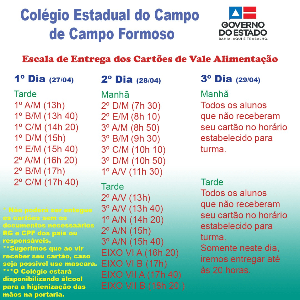 O Colégio Estadual do Campo de Campo Formoso comunica aos seus estudantes, pais ou responsáveis; que a partir desta Segunda- Feira, dia 27/04/2020, terá início a distribuição do Cartão do Vale Alimentação Estudantil.