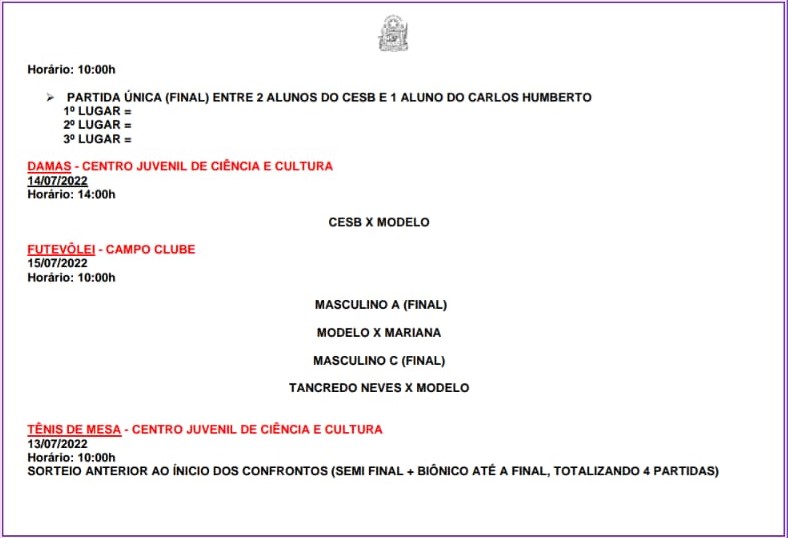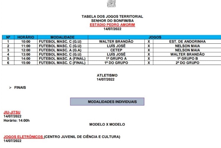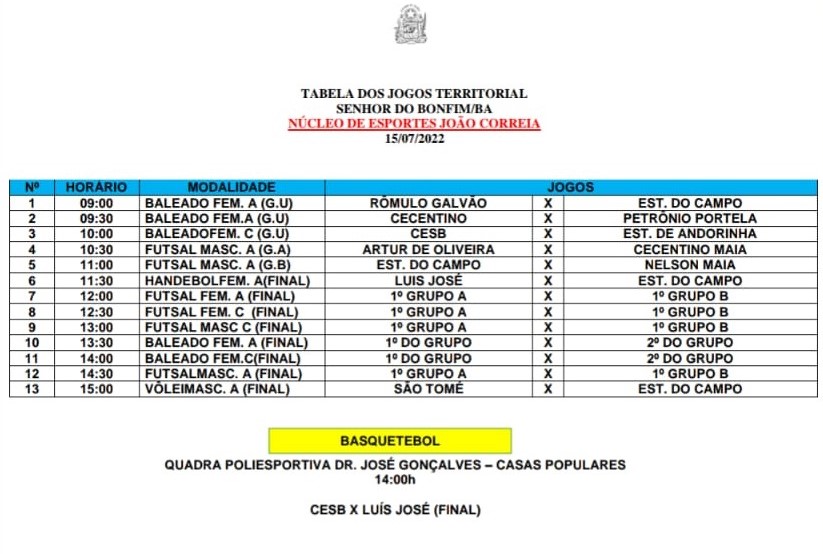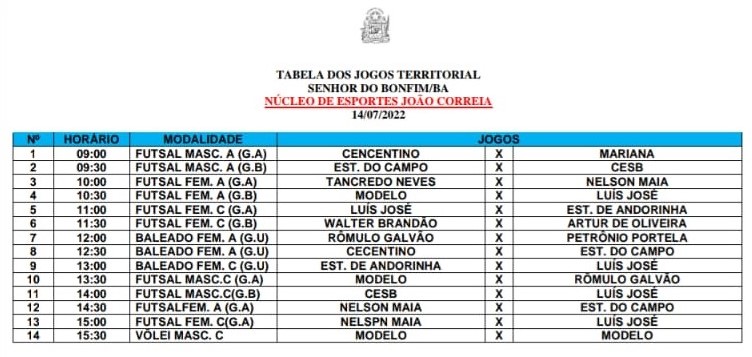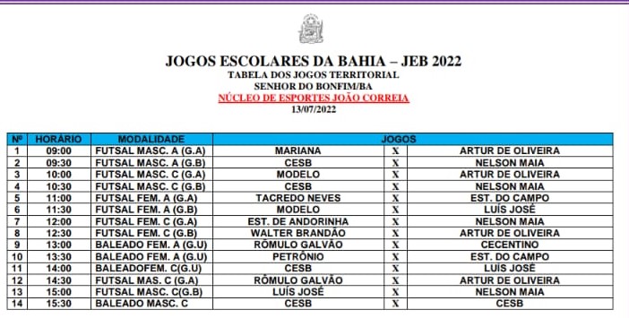 O Núcleo Territorial de Educação- NTE 25 divulga tabela da sequência dos Jogos Escolares da Bahia- JEB, Etapa Territorial de Senhor do Bonfim; à ser realizado entre os dias 13 a 15 de Julho de 2022.