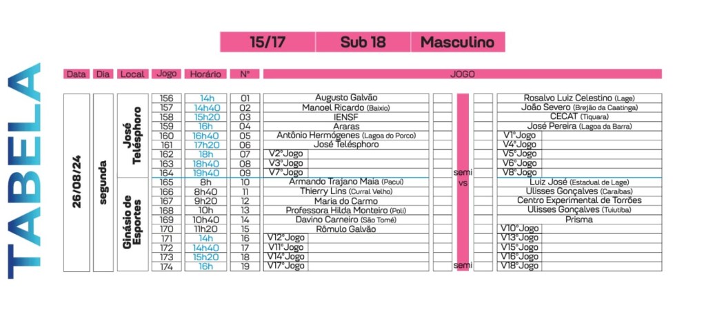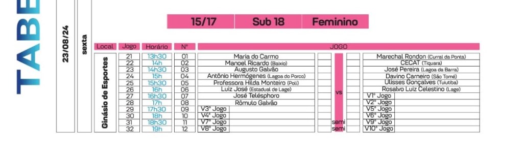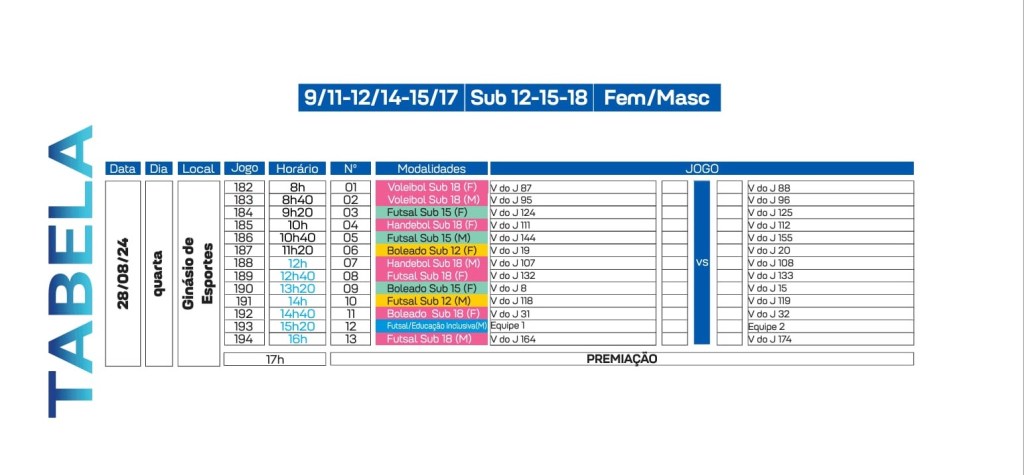 Segue abaixo, Tabela da XXIII Edição dos Jogos Escolares de Campo Formoso 2024.