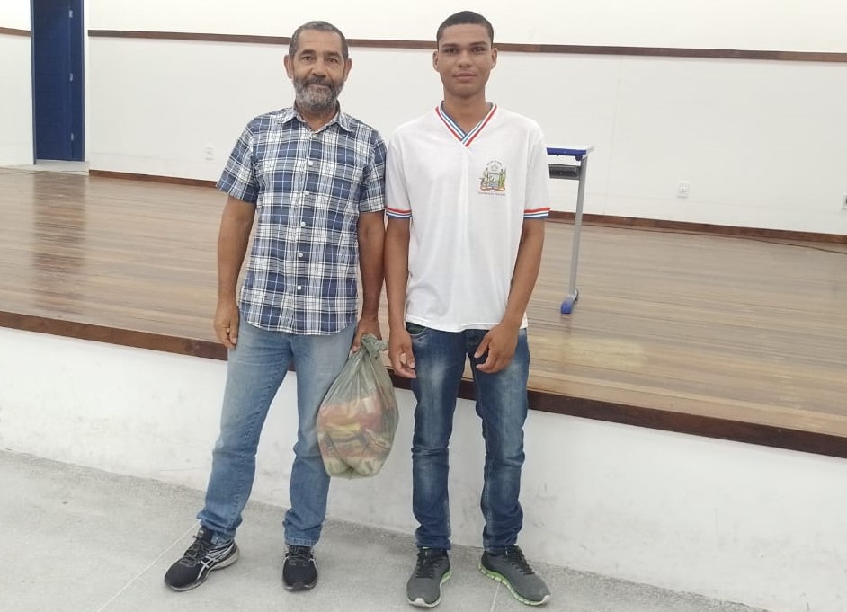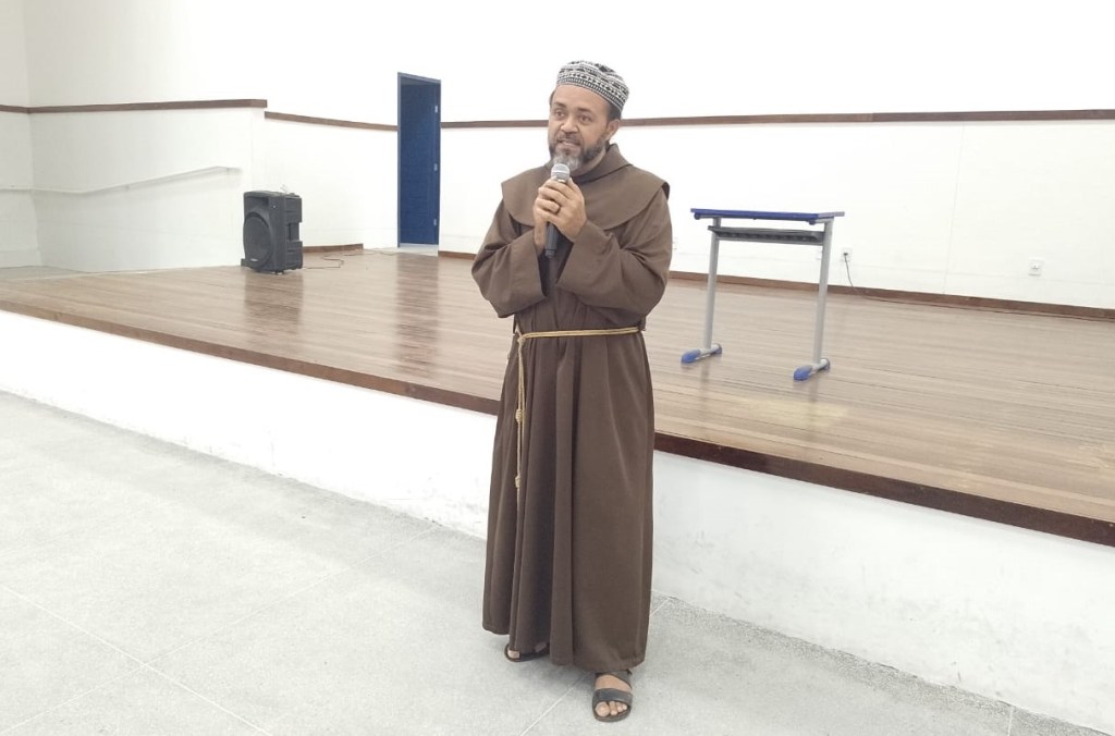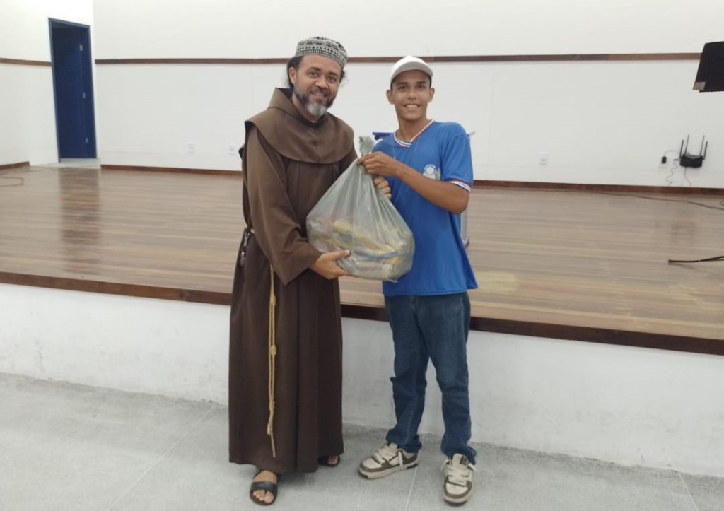 Frei Francisco Recebendo Cesta Básica Simbólica de Aluno do Hilda