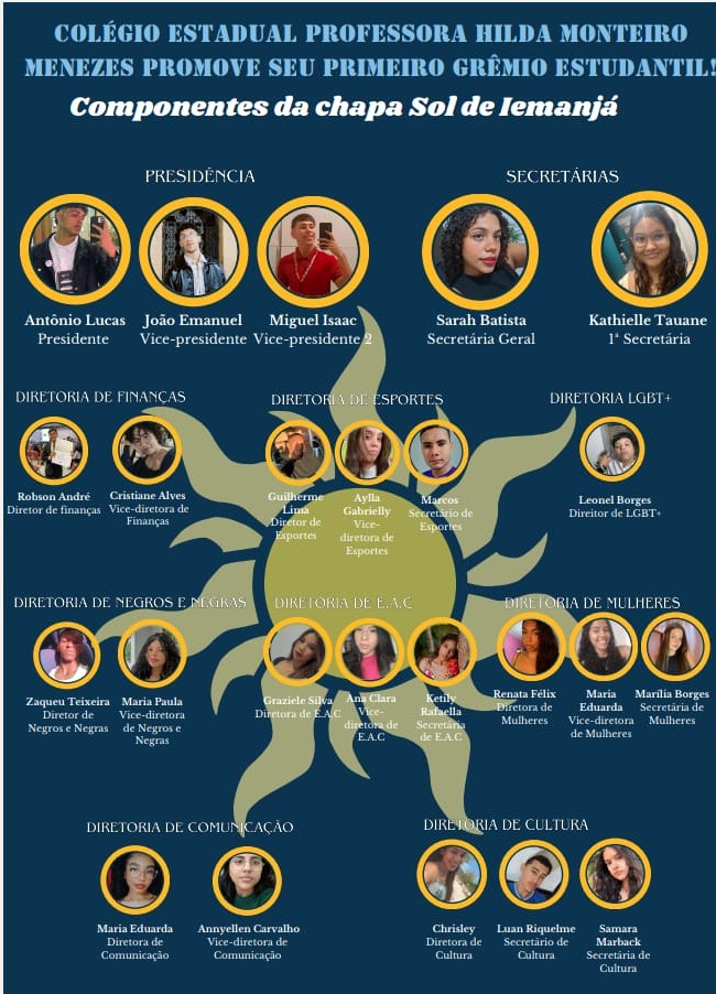 A citada Eleição, teve como concorrente “Chapa Única”, esta intitulada “Sol de Iemanjá”, formada por Alunos do 1º e 2º Ano, dos Turnos Matutino e Vespertino de nossa Instituição de Ensino, bem como do Anexo de Tiquara. Esta tendo como Presidente o Aluno: Antônio Lucas de Sales de Oliveira.
