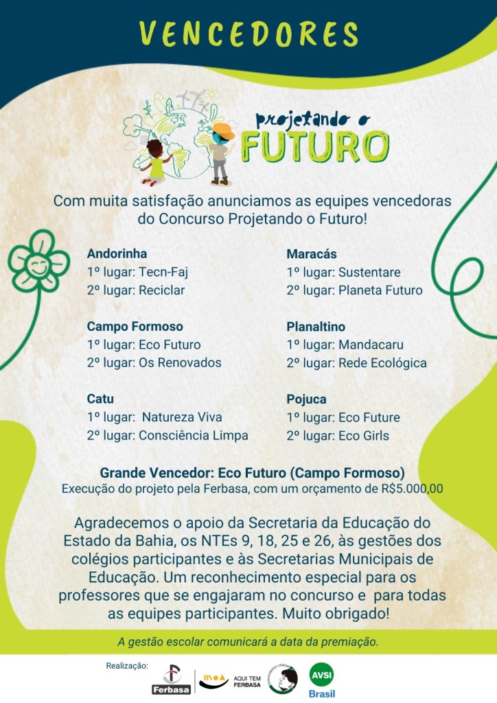 Tendo como tema- Soluções Inteligentes para a Gestão de Resíduos Sólidos, o Concurso “Projetando o Futuro”, promovido pela Ferbasa, mobilizou, nos últimos três meses, 182 Estudantes de Escolas Públicas Estaduais dos Municípios de: Campo Formoso, Andorinha, Catu, Maracás, Planaltina e Pojuca.