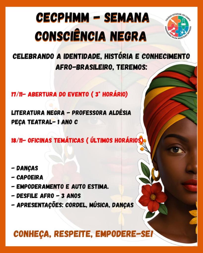 Ao longo dos dias 17 e 18 de Novembro do Corrente Ano, o Colégio Estadual do Campo Profª Hilda Monteiro Menezes, promoveu grande Programação Especial relacionada a Celebração do “Dia da Consciência Negra”, esta nos Turnos Matutino e Vespertino, no âmbito de nossa Instituição de Ensino no Ano de 2025.